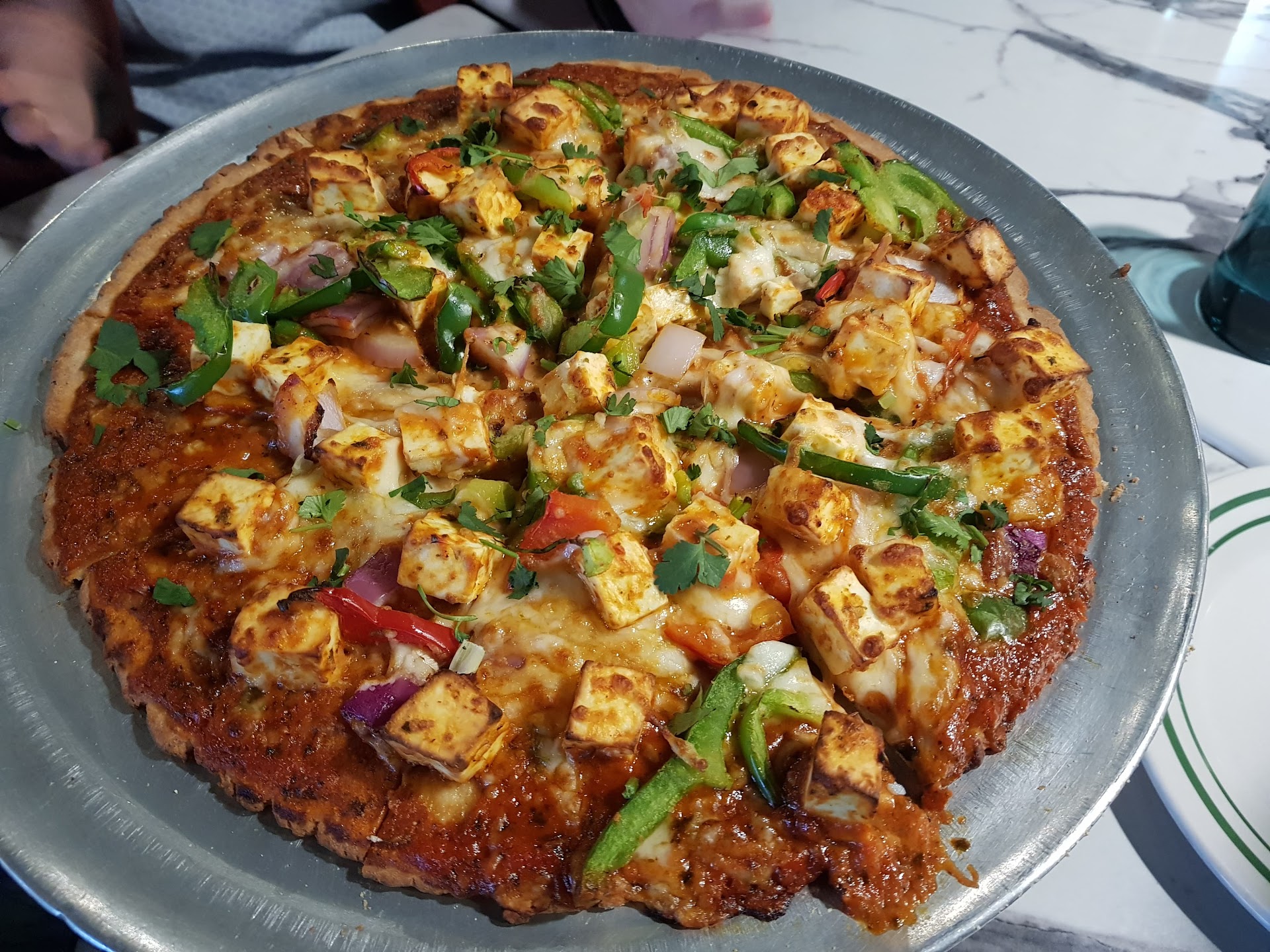 March 29 (Saturday), 2025. We came here for lunch to execute our previous night's unfulfilled desire/plan to eat gluten free Indian flavour pizza. And we did exactly that by ordering a gluten-free 10'' crust paneer tikka masala pizza, with extra topping of capsicum/bell pepper. I also requested the waiter to "go generous with the tikka sauce and paneer pieces" and asked her to count it as an extra topping if needed (the menu doesn't have paneer or sauce in it's list of available extra toppings). I am sure she graciously obliged as the pizza that arrived at our table was so rich in the sauce/gravy and the paneer cubes. It smelled so good, tasted even better, and is arguably the best Indian flavoured pizza I have eaten. The paneer had a good burn/char in it's edges and was still soft and moist. I guess paneer is a legitimate pizza topping option. I couldn't really distinguish the gluten-free crust, it felt normal.