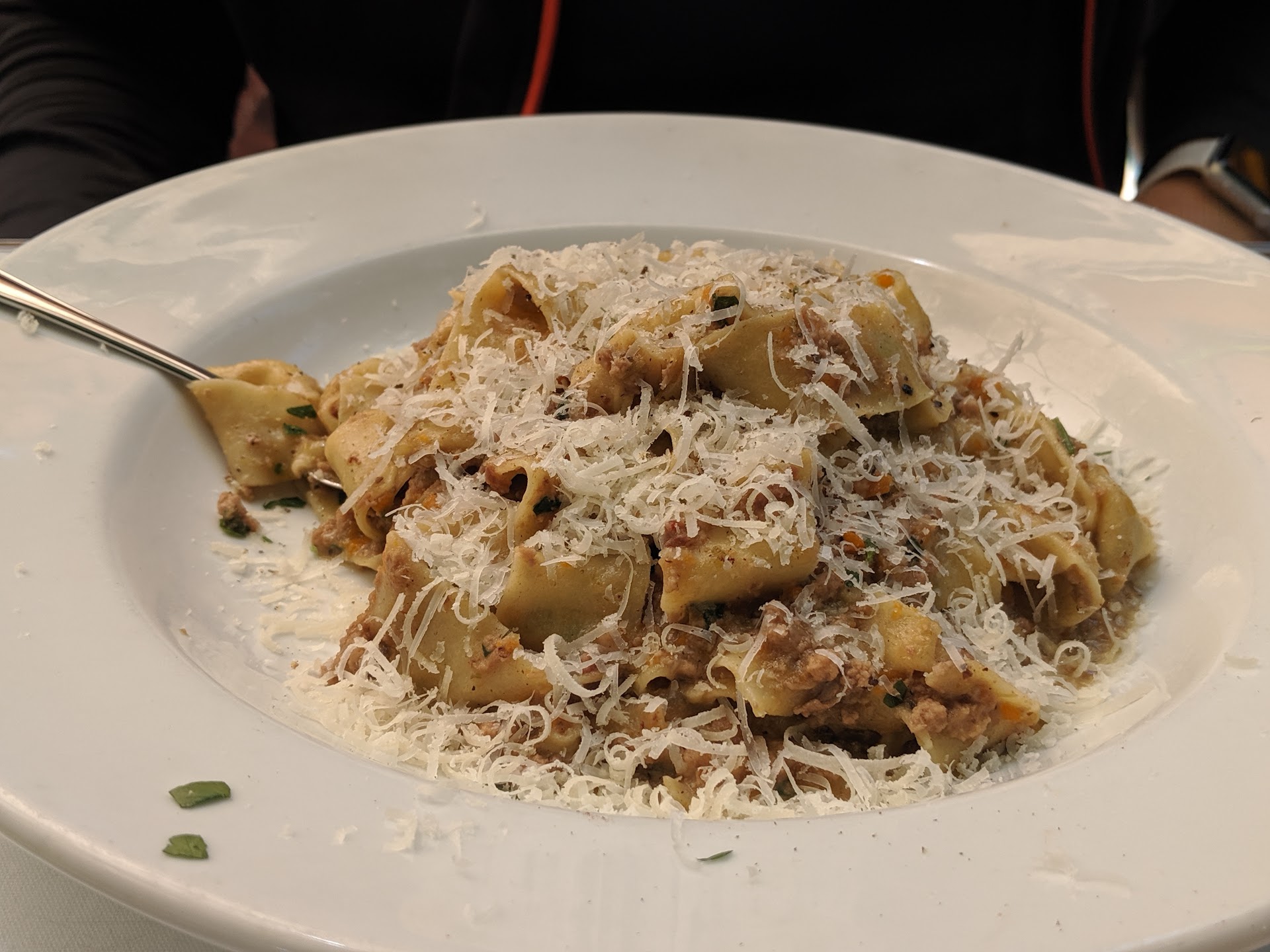 As to the food, the appetizer (burrata with speck) was excellent as always, but my entree of mixed grilled meat was dry and overcooked with spinach which was tough and watery. My wife's duck ragu with truffle oil appeared not to contain any truffle oil.