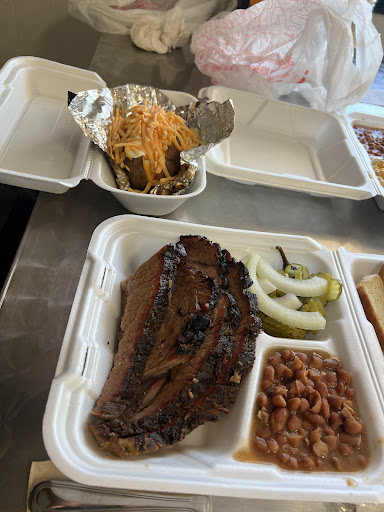I ordered the three-meat plate but chose only brisket, paired with a baked potato and a side of beans. The baked potato arrived only partially heated, with the cheese and butter sitting unmelted on top. The beans were extremely hot in temperature but lacked seasoning altogether. The brisket itself was decent in texture but lacked flavor and seasoning. Only one sauce option was available at the table, which was very basic and did not elevate the meat.