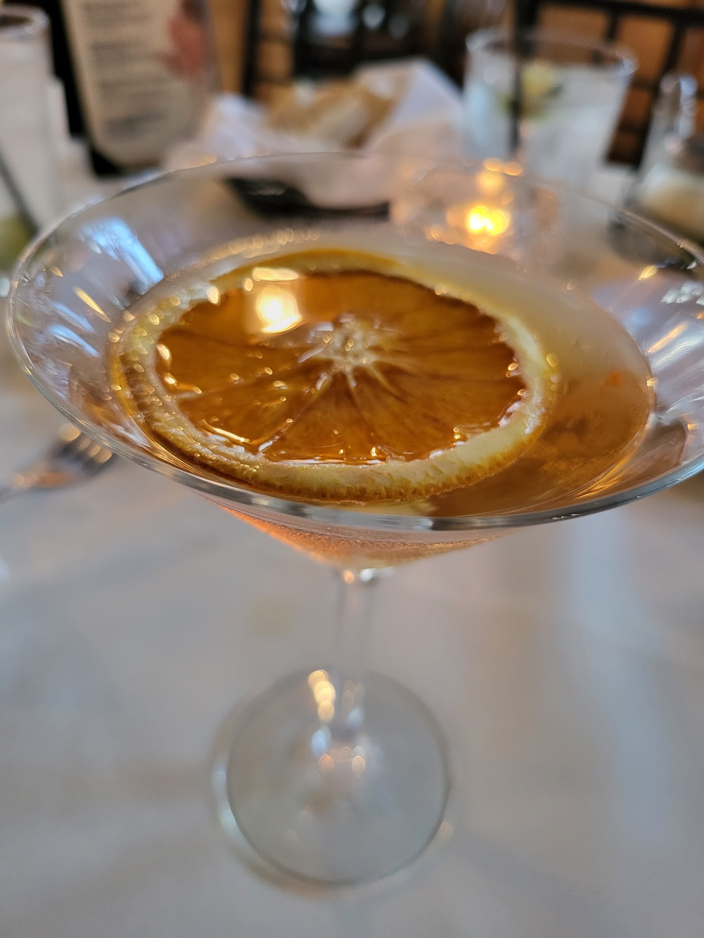 Our server was cordial. We ordered two Saint George Martinis🍸. Presentation was great; flavor was ok (mostly water). Then came the salad 🥗: it would have been much better had the basil 🌿 not completely overpowered the other flavors. The bread 🍞 also would have been better had it been served warm, with butter, and not-so-watered-down olive oil 🫒 (it tasted like someone had intentionally diluted it with water).