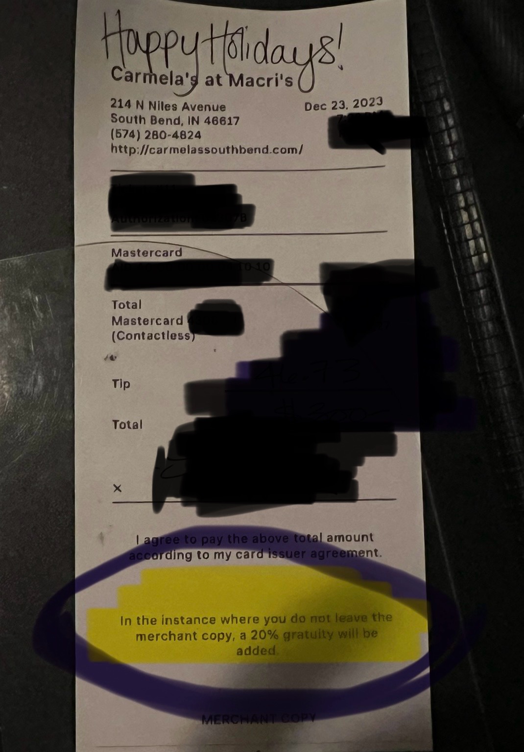 This policy was unclear and Iām TRULY GLAD I read the fine print, but Iām still not sure that clarifies this for me. If one accidentally takes the merchant copy and leave the customer copy, they CHARGE YOU a 20% fee on top of your bill and tip! I Have NEVER HEARD of such a thing! What if a customer writes the tip on the Customer a copy and takes the merchant copy? Would you charge 20 % too? Because that was not made clear. It just says if you take the merchant copy you get a charge. There should be some clarity made there.