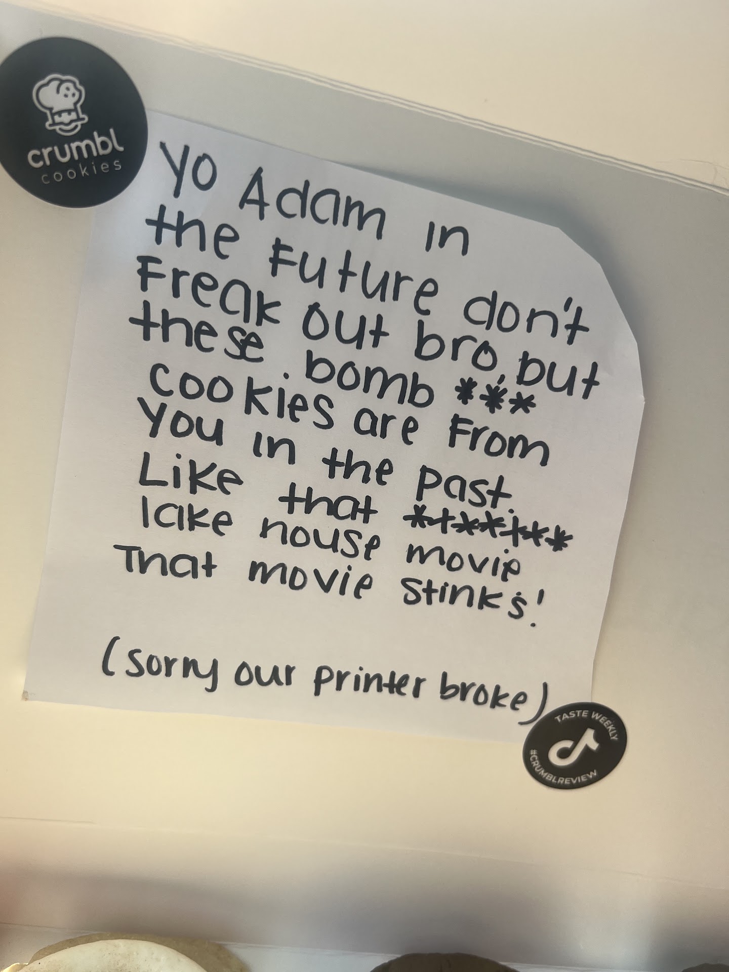 First off I want to say a huge huge props to all of the great staff members that were working on Monday. Not only are they amazing staff but they single-handedly prevented a time paradox from becoming reality, in which case the world as we know it would cease to exist. Now I enjoy being able to leave notes on the cookie box, and I always try to add something fun but these guys went above and beyond because their printer was down but that did not stop them as a matter of fact they took the time to write it all by hand and place it in the box for me. Now hear me out I know some of your people will say oh my God they put a piece of paper in your cookie box, yeah and I’m happy they did because that shows them going above and beyond.“plus they’re not your cookies anyway” but honestly will always be back thank you guys for saving the day and not letting the Lakehouse movie really exist. It was all just a dream but also go get your cookies here they’re awesome thank you staff! To the manager I hope you read this you should be very proud to have employees like that this day and age. And thank you for indulging me and my childish...