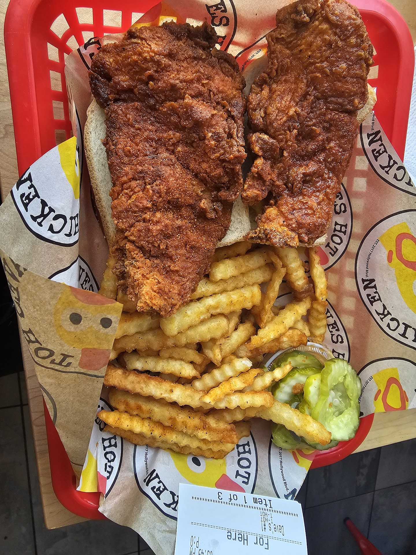 Ā Ā Ā Read moreSo Iāll start by saying our two first trips here were great. Ordering at the restaurant to go. Spice was on point. Everything was solid. Tonight we ordered online and everything was not so great. First, my husband and I love spicy food. Nothing in IN is spicy enough coming from Ca and Tx. Tonight we ordered online. We each got one slider and one tender. I ordered both tenders w/no bread bc we donāt love the plain white bread slices. We each ended up with no slider and a tender w/bread. So that was disappointing but not a huge deal. We normally get hot for me and extra hot for him. Which in the past were perfect and definitely not too spicy in the least. But he chose reaper and extra hot, and I went extra hot and hot. Everything was basically the same spice level and it was all insanely hot compared to what weāve ordered before. The extra hot and hot were so spicy I couldnāt eat them. There was no difference between the two. The spice level was much different this time than when weāve been there before. I donāt know if itās because it was late on a Sun night, new staff than they had before, or what the issue was. Iād love to give them another shot but this round was pretty...