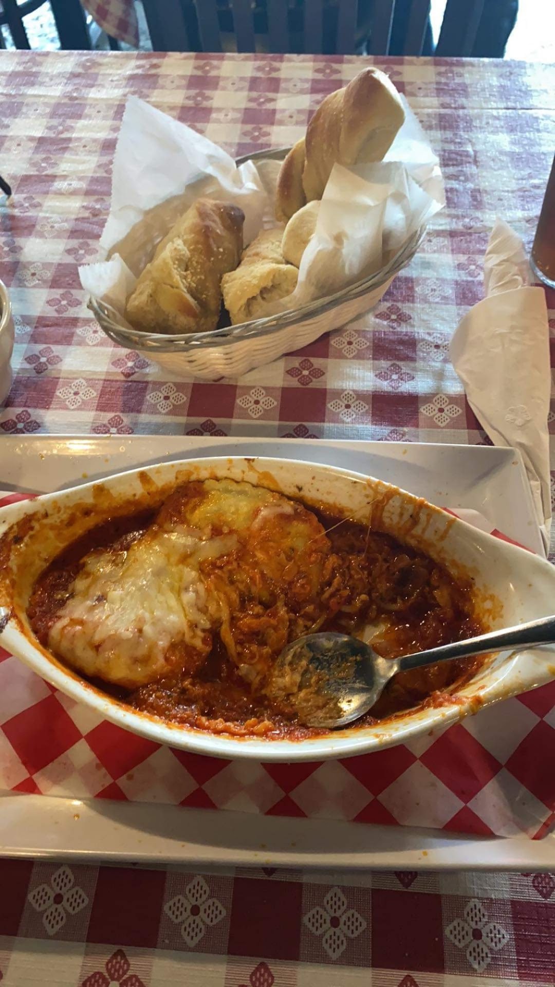 Read moreWhen looking at the outside, you wouldn't realize this place is uber cozy and welcoming inside. We did sit next to the window to see outside, but we both work inside without windows. Every other seat is cozy and quaint. We were greeted and sat quickly. There weren't long waits, which was extra nice for us. The waitress, Kelly, was very friendly and helpful. I ordered onion rings for an appetizer. They were delicious! Thick slices perfectly battered and fried. I had soup with my meal. Tomato, basil bisque was flavorful and served piping hot. My husband ordered the salad. Breadsticks are soft and chewy, with a buttery, garlic taste. I ordered the eggplant parmesan with angel hair pasta. The pasta was overcooked but not fall apart, just breaking up in my fork twirl. The eggplant wasn't very flavorful. I didn't get that taste I expected. The sauce was very good. My husband's panini was underwhelming to say the least. It was bread, meat, and cheese on panini pressed bread. No sauce, no veggies, and maybe he should have asked for those things as they were not labeled on the menu. I just expected more from the sandwich. We did get tiramisu for dessert. It was good, not mind blowing, but it was...