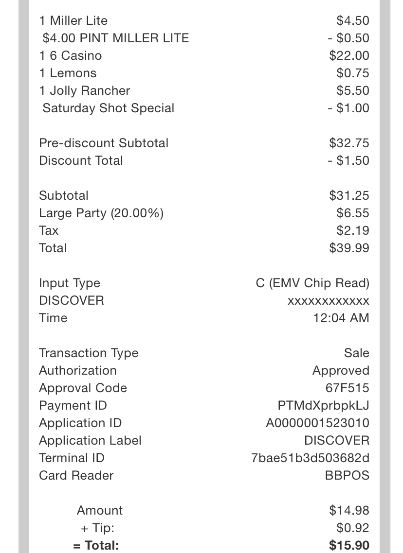 I went last night to celebrate my birthday with a group of friends. Me and 5 others. The menu states âparties of SEVEN or more will be charged 20% gratuityâ. They charged all of us 20% and still asked for a tip on top of that. I was the only one who asked for a receipt because it was ridiculous to me that my bill was so high. I got 6 oysters ($22) a miller lite ($4.50) and a jolly rancher shot ($4.50) = $31 total. I had a gift card for $25. So my bill should have been $6 and some change. Instead it was $15.98. I asked the server how is this possible? And he replied that he âhad no ideaâ and âdoesnât understand math unless itâs trigonometryâ he even told my friend who ordered potato wedges and a coke (her bill was almost $20) that her bill was so high âbecause she ordered a side of ranchâ he did NOT tell us he was charging us for having a âpartyâ. I was the only person who asked for a receipt and I asked to look at his tablet. I think itâs crazy they donât give paper receipts or anything like that. I want to SEE what I was charged for. We all felt robbed. We asked to see a manager and she had some bullshit excuse about how he ârang it inâ. So I have to pay 20% + my bill + a tip because of the way the server rang my food in?? Itâs very unprofessional and crazy. It was also extremely frustrating because I am a local and I love supporting South Bend business. Iâm not some Notre Dame kid with daddyâs money. I work hard for MY money and they literally scammed me and my friends by charging us this fee. If the server would have communicated this BEFORE he did it, I wouldnât have been so upset. I will never...