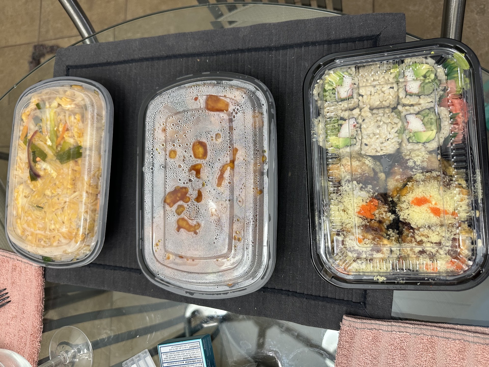 Finally, more about the FOOD “APPETIZER: A morsel or two taken ahead of the main course to stimulate the appetite”. I began with the California Roll. In one of the photos it’s the two things each with three sections reminiscent of the body of a large ant. I cannot remember what it’s supposed to be made of because I could not discern any ingredient. (Referring to menu) Certainly not the “crabstick” listed as the first ingredient. Maybe there’s supposed to be a skewer once used to procure the crab from the murky waters. In any event, these in no way reminded me of California. On to the Crispy Spicy Salmon Roll, which was in fact none of those, although it does emit an unpleasant odor of fish. Appetizing, they were not. Still searching fire simmering I was willing to eat I moved on to the Pad Thai Chicken. They should call this dish Pad Thai Noodles because that’s about all I found in there. Interestingly, stuck to the underside of the lid are a few scraps of dark green stuff that probably is overcooked cabbage. Those must have been inadvertently dropped there from a serving utensil headed for someone else’s order because I found no cabbage, green nor white, in the dish. There are very few small scraps of something that doesn’t taste at all like chicken, nor anything else. There is no sauce.