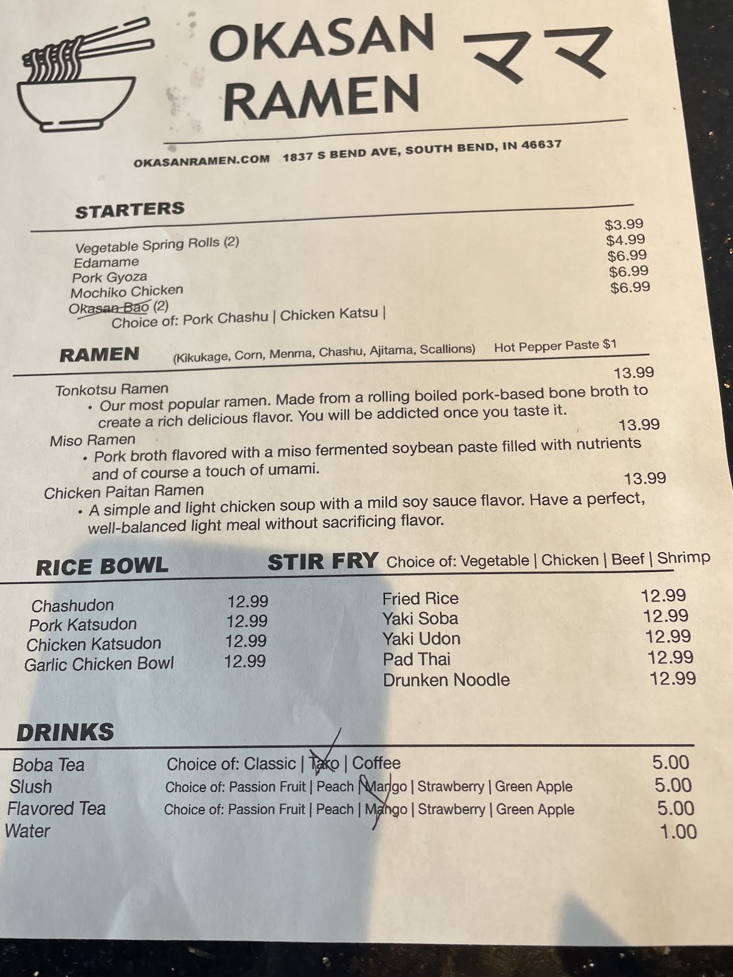 Read moreBeing in the army I have traveled to various locations and tried different foods both good and bad. My favorite food is ramen and with moving to South bend for my new Army location there are limited options for ramen in this area. I searched the Okasan ramen resturant and notice all the great reviews when it comes to their ramen. As any other person who see good reviews for a meal they enjoy I tried the place out. I tried the miso and the tonkotsu ramen and when the bowls came to my table it looked great. The nice slices of pork, the boiled egg, and all the other fixings. My mouth was watering and I was ready to take a nice slurp of ramen, but where they failed was the taste and let me tell you it was not good at all. The pork had a strong porky taste that was not fresh. The ramen had a terrible after taste and the boba tea was artificial with a horrific after taste as well. I was able to atleast finish one bowl of ramen and the boba tea due to only ensuring I had something in my stomach since I have not eaten all day in anticipation of having some good ramen. I would recommend that they find out what is causing that after taste in the ramen and I may come back again. I honestly wanted to like it but I guess I will be eating packaged ramen until my next duty...