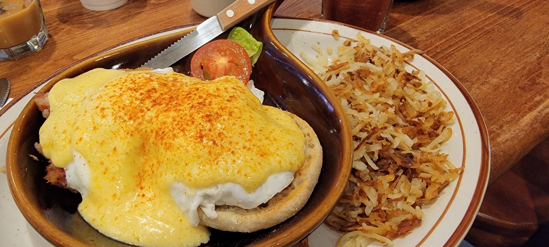 No schmears for me! Also, no dill seasoning, or capers, only 1 tiny tomato slice, and no onions to be seen. My New Yawk pals might be apoplectic with this presentation, but local foodies would see it as a 'Real Deal' - for a local, specialty Benedict: If you can't get a primo, thin sliced, smoked, Lox Salmon portion, make up for it with a huge portion size - the Midwestern way! Yessssss!