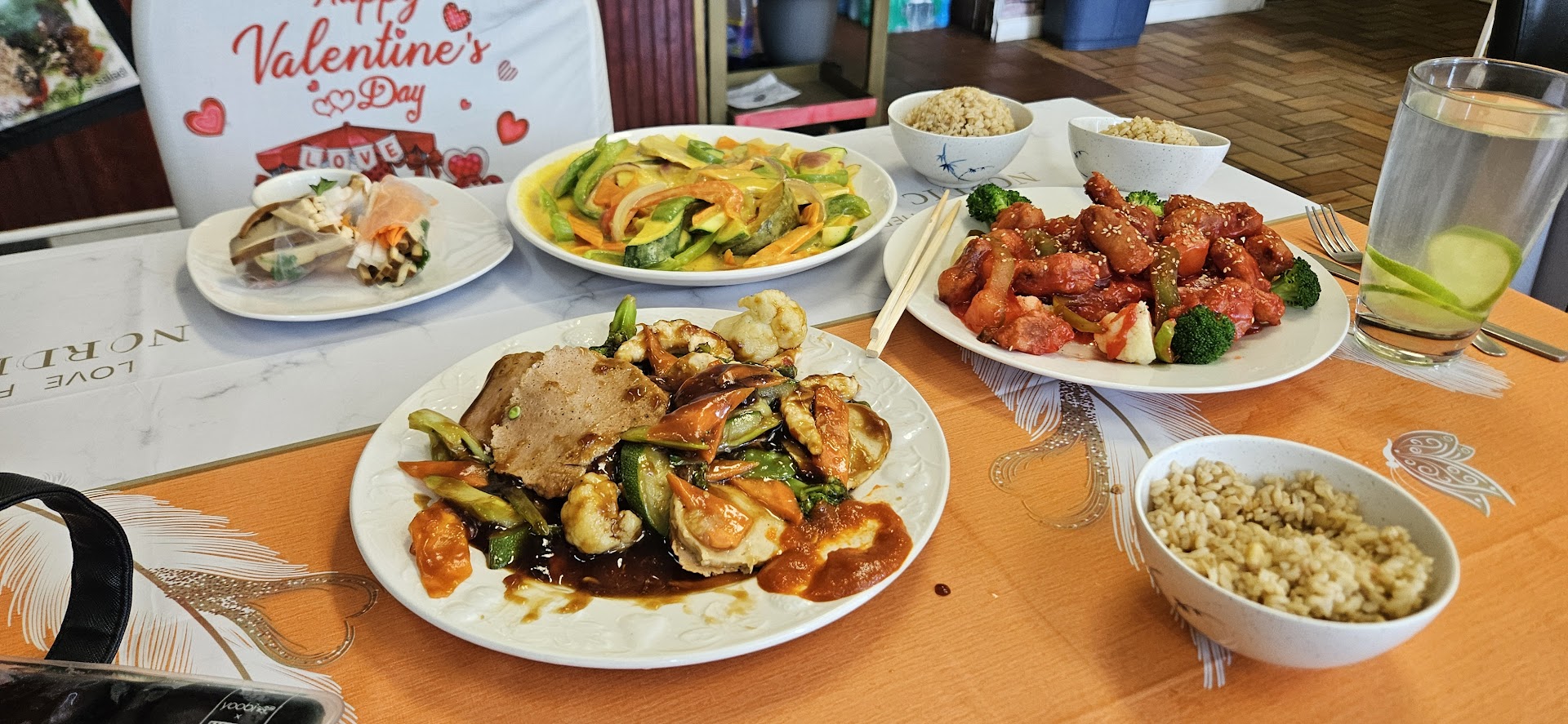 Now, we get to the good stuff. There are two menus, a picture one to give you an idea of some of the dishes, and the written one with everything on it. Drink selection is alright, nothing out of the ordinary and nothing spectacular; sodas waters and some bottled tea. Today, we splurged and went with a medley to share. For Starters we went with the Vietnamese spring roll, which we both really liked. Veggies were fresh and crispy, light and the dipping sauce didn't sit on it too heavily. Would def recommend them. The next starter was the Yam and Taro Tempura. We really liked these. Came hot a fresh right out the fryer. Prob allow to cool for a couple mins before eating, might burn your mouth. Then we had the coconut white rice, which had raisins in it. Not bad, but nothing I'd write home about. Its good mixed with some of the entrees we had but on its own was just okay. The meals we ordered came with a complimentary soup or salad. We both chose the Miso soup, good quality but not breathtaking. Then the Entrees hit! We had done a 3 dish split; the Jade Mushrooms, Singapore Mei Fun and a Veggie General Tso's. The Mei Fun was the least of the three but if thats the low, I can live with it because the Tso's and Jade were outstanding. My friend is strictly veggie and vegan, while I still eat meat. I can say from my perspective the way they cook doesn't make me miss the animal protein at all! The sauces hung on the dishes just the right amount, a good crispy layer and the insides flavorful and delicious on theur own. We might have over ordered though because when we had our fill, there was still a lot of food left over to go.