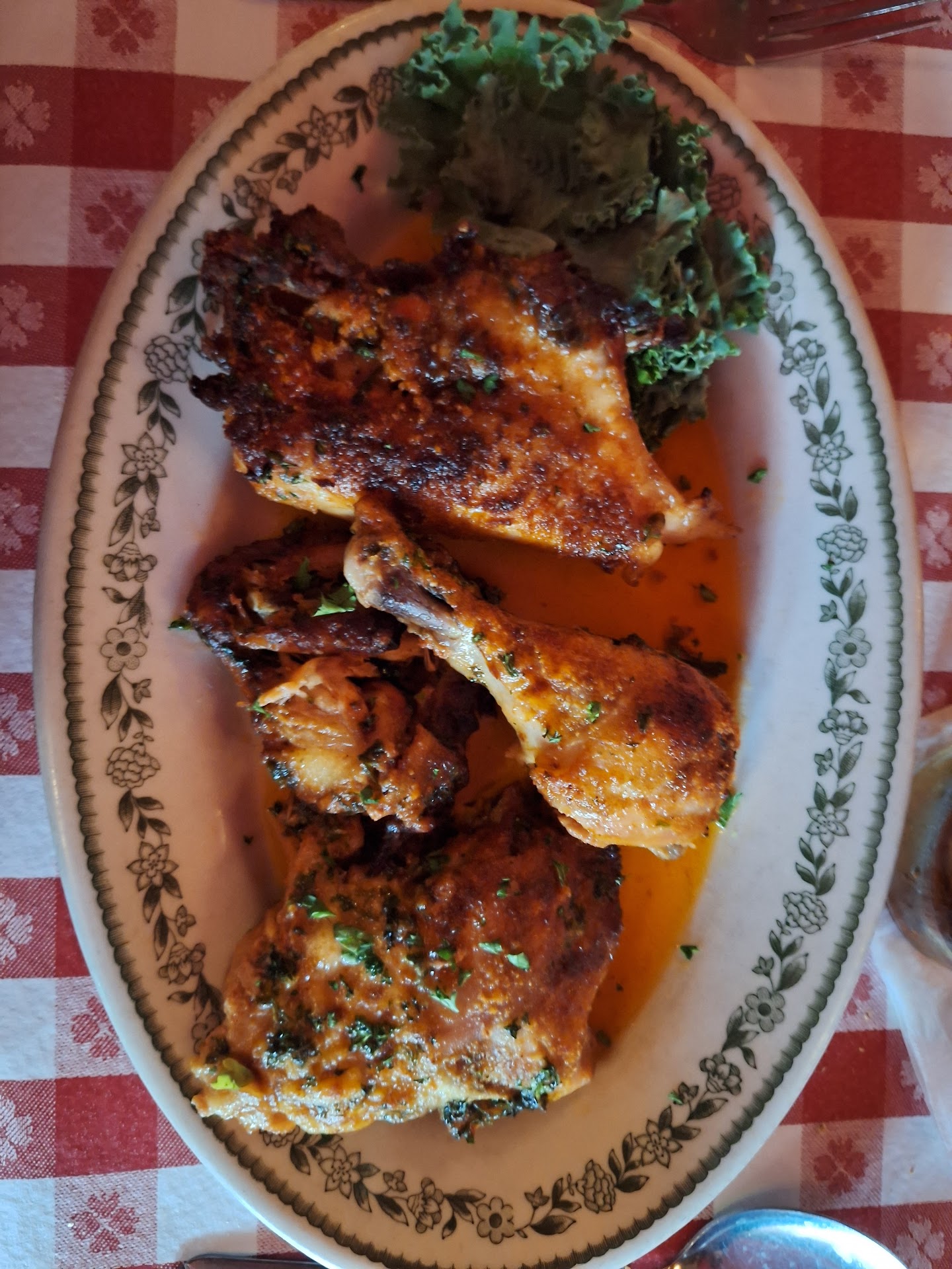 Our server was pleasant but seemed overwhelmed from the small influx of customers. I was disappointed in no soup option. Figured I could get Italian wedding soup or zoupa Toscana. We had ordered the garlic bread and cheese as an appetizer, my wife got chicken cacciatore and I got the fried chicken.