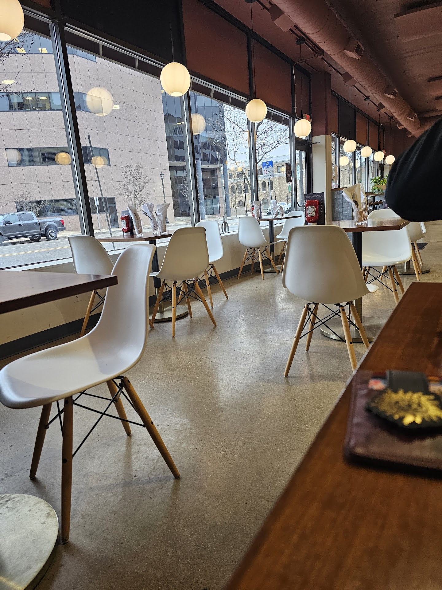 Read moreMy Dad and I had breakfast at The Early Bird this morning for the first time, and we were both thoroughly impressed by the whole experience! Firstly, the atmosphere is very minimal and clean, but in a comfortable way that's not pretentious. When you walk in, there's a cute little bar on the left, with regular, open seating to the right. I love the white chairs and sat in one of those while my Dad sat across from me on the banquette seating he prefers. The real spider plants and the wall-hangings are striking but not overdone, complimenting the space perfectly. The service was great; our server (Shaina? Shanna?! I'm so sorry that I didn't catch your name!) answered several questions for us without seeming annoyed and was knowledgeable about the menu and specials. She sold me on a "Bees Knees" latte (non-alcoholic and not similar to the cocktail of the same name), with lavender and thyme that was perfectly balanced and not overly sweet like so many coffee drinks are these days. As it should be, the food was the star of the show! I had the blueberry pancakes with lemon cream cheese in the middle. They are to die for! The amount of lemon creme in the middle of the cakes was just right, as was the flavor-- the perfect amount of tartness to accent the sweet blueberry compote atop the pile of goodness. The vanilla crumbles sprinkled over the whole plate added a bit of texture and visual interest. Looking at the menu initially, I'd been going back and forth about what to order (I'll go for the shrimp and grits or one of their breakfast bowls next time), but I definitely made the right decision today! Dad had Eggs Benedict which he really liked, and he's basically a connoisseur of the dish. The potatoes that come with it were also excellent, crispy on the outside and fluffy within. I had to take half of my meal home, as it's an enormous portion; when bringing me a to go box, Shaina/Shanna (I'm sorry!!) advised me to eat my pancakes cold from the fridge, "like cake," which I am doing while typing this. She was spot on with that suggestion! Lunch is next to try, as the menu is chock full of yummy- sounding options... We were happy to discover a new and delicious place to dine this morning in The Early Bird! Thank you for the awesome food and...