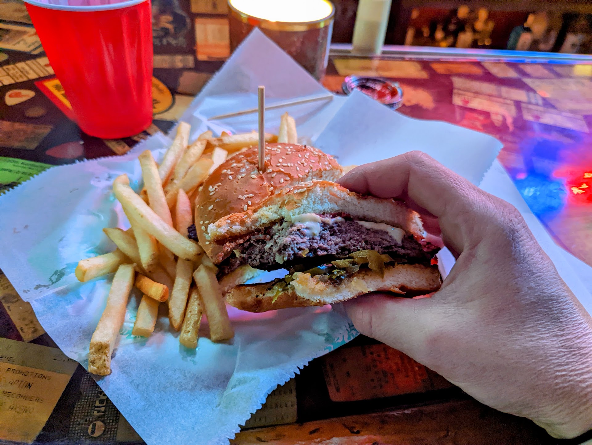 I did eat locally. Went across the street for a delicious meal. The Two star reveiw was for the actual bar. I was going to leave that part out but now i guess I should mention that the place smells like an ashe tray, the waitress refused to let us sit at an empty table because she was holding it for people that were outside. I can only imagine it was one of the crackheads yelling at us that they were being followed. Not to mention my forearms stuck to the table.