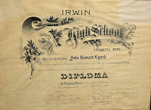 Read moreStepping into Cracker Barrel, not only are you hit with the cozy, nostalgia-infused atmosphere that feels like your grandma’s living room, but also with a historical treasure – none other than John Howard Lynch’s 1895 diploma from Irwin High School. Positioned perfectly between old country store knick-knacks and antique farm tools, this diploma adds a quaint touch of educational heritage right in Pennsylvania, where Lynch's family has deep roots.