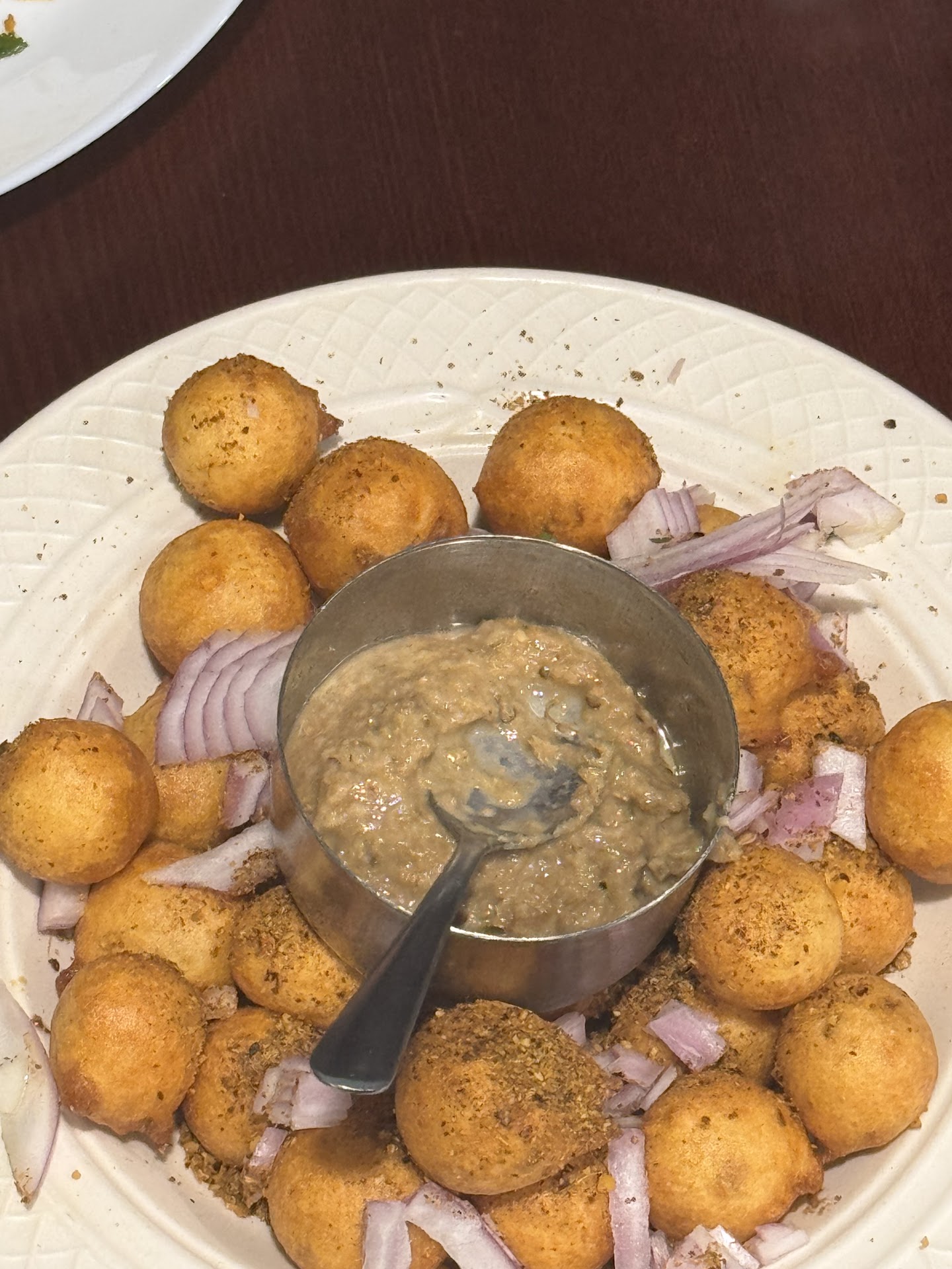 Punugulu – These little golden, crispy dumplings made from rice and urad dal batter were a delightful surprise. They had a crunchy exterior with a soft, airy inside and were served with a delicious chutney that complemented them well.