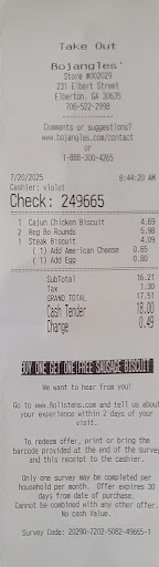 Hate to take away stars but here we go. 1st visit was great. The next two have been awful. :( I upped my grits from small to large and both times when I get to my office.... my grits are in the bag. Literally in the bag. May have no more than 2 spoons left in the bowl. It appears that the cup and lid aren't made for each other as it appears I am not made for this bojangles. Again great drive thru service but can't tolerate grits not in the bowl when I go to eat...