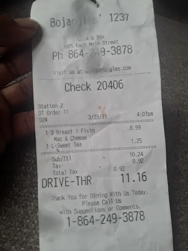 I just got home from bojangles, Istopped by to get a quick bite on the way home. I ordered the 3 piece meal ,I spacifily asked for 2 legs and a thigh, with macaroni and cheese and added a large sweet tea, the menu board said the meal was something like $6.59,as I said I added the tea, the young lady said my total was like $11.16, so I got to the window and the young lady said my total was$11.16 I questioned her asking ,if the meal is $6.59, how is my total $11.16? That would make the large tea cost a little over $3. So she closed the window and rang it up again, she came back to the window and said the girl was new and she rang it up wrong, but if I had not questioned it , she would have taken my money, because she asked for the $11.16. So I saw that it said that it came with 2 sides and I was trying to ask her if the price was supposed to be different since I only got 1 side, she told me to calm down, and I told her, I was calm and that I was just trying to ask her a question. So I paid like $8.46. She gave me my food and drink, didnt say nothing, just closed the window. So I get all the way home, fed my granddaughter and I just looked at my receipt, it's the receipt from the wrong order and I looked on the website, my 3 with 1side should have been $5.29 plus the large tea,$1.25, should have been $6.54, plus tax,$6.87, I paid like $8.46. I was over charged and the girl...