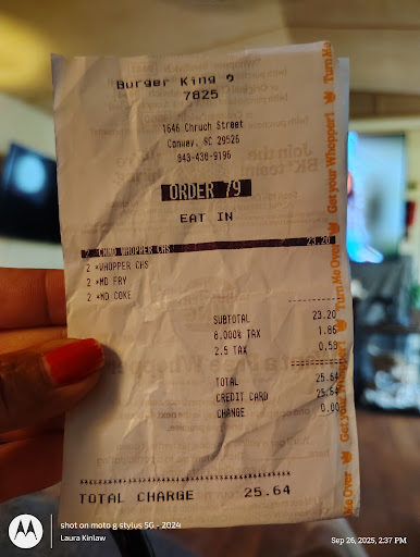 To start thank you for the opportunity to do a review. My husband and I moved to Conway in 2012 Always heard bad things and bad reviews on line about BK Today we decided to see for ourselves and dined in for lunch. We placed our order. We finally figured out how to use the Very nice Brand New soda dispenser ☺️. I proceeded to find us seats we would enjoy eating our meal. I sat waiting patiently, my husband still waiting for our order. They had what I consider for the store to be busy but not to busy to give me my food (An inside diner) who's husband was waiting so long I thought WI hat the world. He came to the table I had chosen looking flustered. He says" They put our burgers on the tray then proceed to fill all the to go orders after then put last of fries on our tray. He then says the burgers are probably cold because they sat on tray not under the. heat lamp for a good while. Minutes of course. I said after trying the 🍟 well at least they are fresh. We then chatted and proceeded to eat our lunch. I noticed people coming and going so they had some foot traffic during our visit. Everyone seemed very business oriented. Could've performed some task better in my humble opinion. While we were eating The young lady that was our cashier Has no customers in line. only diners eating in Then she proceeded to began to start cleaning and whipping tables. Which I thought from a former food industry worker "If you have time to lean You have time to clean". So I'm our opinion it wasn't as bad as everyone's low review But it could be better. Please understand this isn't a bad review at all I wish I could've given 5 stars but we can't. We will definitely go there again. This was a Friday lunch so Conway was hustling, Over all...