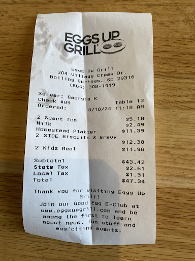 SInce moving from Miami to the Upstate, I have visited multiple Eggs Up locations, and have always had a good experience with good food. We moved from Greer to Inman recently and by far this is the worst location. Maybe it was an "off" day? But tables were dirty, bathroom was dirty, waited 30 minutes for cold food, AND cold coffee. Even my kids were asking to go to another location next time. I will be calling and asking for a refund. Just overall bad experience.
