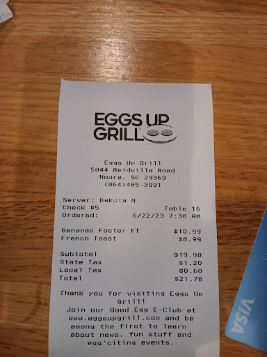 I ordered shrimp n grits. I’ve eaten here many times in the past and was satisfied with the breakfasts that I ordered. They do have a new menu now. I was looking forward to the shrimp and grits after having them at Fleetwood Landing in Charleston pretty perfect, The French Restaurant in Spartanburg a bit over the top spicy, River Falls Cafe delicious. So I’m sorry to say at Eggs Up there was absolutely NO Flavor. There was no Salt, no Spice, no flavor. It was like eating plain untouched grits before adding the goodies.