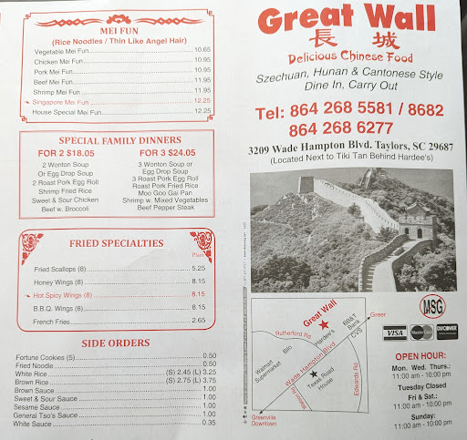 Let me say that we have ordered Food from this Chinese Takeout Restaurant many times over the past 10 years or so. Not because of the quality of the food which is average. But for convenience due to the close proximity to our home. The food is hit or miss. Average @ best. Their food quality & recipes have changed from time to time but the food was fair until last evening. The weather was nasty last night & we didn't feel like driving far. So like many other occasions, Great Wall on Wade Hampton Ave was our choice. We only order 4 familiar items. Items we felt were some of their better dishes. Pork Fried Rice, Wonton Soup, Chicken on a Stick and Moo Shu Pork. Aside from the Wonton soup which was bland but edible. The other items were not fit for consumption. The Chicken on a stick (we've had it before and liked it) was actually so over cooked it came out of the Bag BLACK! I tried it. Burnt, with the aroma and flavor of Charcoal. The dish had been severely overcooked. Well past the point to be saved by any sauces. It should have never been served to a customer. Especially a customer who has spent as much $$ in the Restaurant as myself. (I usually order for 6-9 people @ a time) The Pork Fried Rice was even more disappointing if that's even possible. I opened the QT container and spooned some into my bowl. RICE! Light Brown Rice! NOT ONE PIECE OF PORK! No Onion of any kind! Literally Nothing but some rice and soy sauce. I dont believe it was even fried in a wok! It surely wasn't fried @ all. NO FLAVOR! I paid for Pork Fried Rice and I got White Rice and Soy Sauce! How does this happen by accident? IMO it doesn't. Then came the Moo Shu Pork. This looked like something that came out of a can or was sitting around for several days. I refused to eat it fearing some unwanted consequences. We have had some OK meals from this Restaurant and Some not very good meals from this Restaurant. But last night was the last straw. I feel as if they dont even care about their customers. Not when you purposely serve food looking and tasting like the food I paid for. My $$ was completely wasted because the value I received was not a good faith effort. I will not be frequenting this establishment again. I'm sure they will not miss the several Hundred $$ I spend every yr but @ least I know I'm not throwing my $$ away to an...