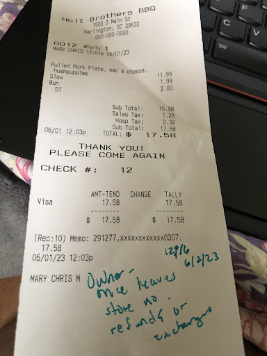 Ā Ā Ā Read morePurchased a Pulled Pork Plate, mac & cheese, hushpuppies, slaw and bun yesterday 06/01/23. The pulled pork was tough, could not eat, mac & cheese was not good at all and at the bottom had hard pieces of something in it. The hushpuppies were not done inside, could not eat. I worked a double yesterday in NC and was unable to call about the disappointment until now, literally 10 minutes ago, today 06/02/23. I called the lady told me she spoke with the owner and he stated that he was gone for a while yesterday and had another person working and that might be why the quality was off but still with giving the knowledge she told me the owner stated they have a policy that they do not do exchanges or refunds, once it leave the store that's on me. How you going to not give me any of my money back and you sold me Raw food???!!! I explained to her no one is going to cut open hushpuppies to make sure they are done or stand in the restaurant and taste test the food before they leave. I am very disappointed with the lack of business orientation and concern for the customer (ME) after I chose their location to spend my hardworking money by which was not pennies- my bill was $17.58. I want my money back. I will never eat her again and will tell all my fellow associates that work locally in the area to not support this...