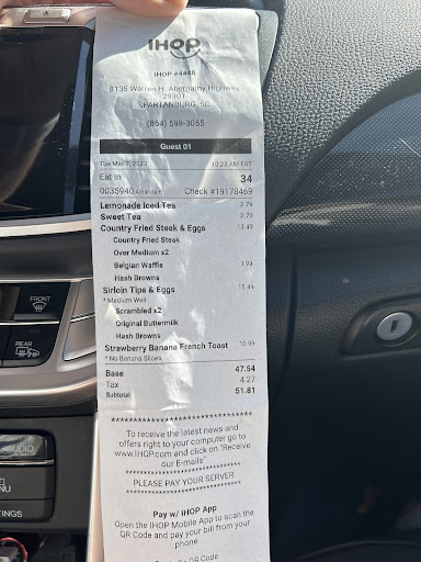 Ā Ā Ā Read moreI do not mind giving great reviews if I have a wonderful experience it important to say so. I like many ppl read reviews. This unfortunately was not a great experience. I went on Saturday 23rd of Nov with my husband. We were craving pancakes and have not been to ihop in years. We where out shopping and thought why not treat ourselves. When we walked in, it was at least 6 ppl online to be seated. The restaurant was nearly empty. All the employees was seated looking to see who would get up to seat us. 1st red flags. Finally someone came and young lady was not pleasant and her uniform was very dirty 2nd red flag. We order our food and then looked around and the place was dirty. 3rd red flag. At this point we where ready to leave. However we already order and was very hungry. The food came shortly after and my husband food was burnt and my pancakes and eggs taste like old grease. We asked to speak to the manager because our waiter was to busy to attend to us. We decided not to eat the food and just pay for thr orange juice. I hope they read this review. My goal in reading it was not to just complain but hope that both the establishment, management and employee improve tremendous. IHOP is a stable and hate to see it in that condition. Please fix this management. FYI we went across the street to the waffle house and had better service, it was cleaner and food was not saturated in grease and butter. The staff was friendly and uniform was clean. THAT IS THE WAFFLE HOUSE. Sorry but I don't expect much from the waffle house but i do...