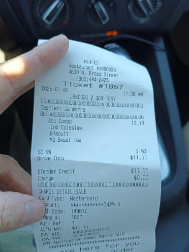 Went to KFC and placed my order, went immediately to the cashier to pay and after few minutes, he gave me my receipt and drink. I waited for a while with my engine running because I was the only one in line and I'm running just about on time for my 12:00 engagement in Columbia, SC. Well, after 20 minutes waiting, the cashier comes and asks me if it's ok to wait 4 minutes for my order (4-piece tender combo). I stated that he should have asked me for that 10 minutes prior. I'm late and I told him to give me whatever was ready. He stayed that the Original Chicken was ready. I said "sure", then he offered the 4-piece. I agreed and then he started working on the machine to try to charge me extra. I stated that I wasn't going to pay extra. I would have taken a 3-piece but not have another transaction in my credit card. He called who I think was the manager. At this time 2 more minutes had passed and the cashier never came back to tell me what they were working on. I left without my money. I'm now driving to my engagement after picking up my wife. In case you wonder why I am typing. I used to love this place. However, I think they changed management because they are now consistently providing bad and worse service. The young cashier stated that it wasn't his fault that they had not put in the order on time because he was talking care of other customers. I'm sure their system needs to be automated. There is no way that in 2025, you have to tell the cook what to put in the microwave. I bet you they are microwaving the food because I won't trust those employees to use open flame. I'm looking at my account and don't see a refund there yet.