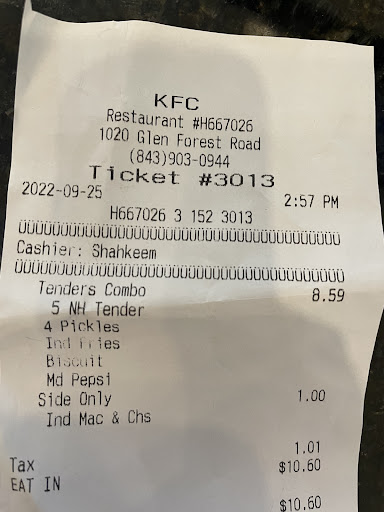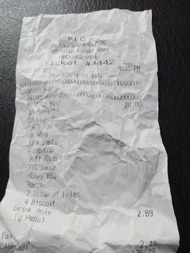Read moreI specifically asked for TWO SEPARATE ORDERS. I even said I have two different credit cards. I told them my first order, then said for my second order... I'd like a kfc famous bowl with no corn. they said that's fine. I get to the window and she tells me the total is for both orders #13.45. I correct her and say it's two separate orders, and the chicken meal is the first one and hand her my co-workers credit card so she pays for her meal, I pay for mine. I get the receipt back and lo and behold, she didn't change anything. She even had two cups out at first and I corrected her that it was only one drink, the one with the breast meal. She put a cup away and gave me my food. I held out my second card to even see if she'd notice and wonder "hey, maybe that's why he asked for two orders". She just looked at me and I said "so that's it?" she sad yes and to have a nice day and I left. Checked my KFC bowl in the car to make sure they didn't f* up and put corn in it, but I only had a half filled bowl. Must be the famous KFC half filled bowl. And the receipt code isn't printed clear. Ticket 1410 @ 1020 Glen Forest Rd Myrtle Beach SC...