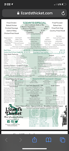 Lizard's Thicket offers a rotating entree each day, and this location has become especially bad about running out of turkey and dressing on Sundays and meatloaf on Wednesdays. We have been disappointed more than 50 % of our visits there in recent months, so much so that we stopped visiting that location for a while.