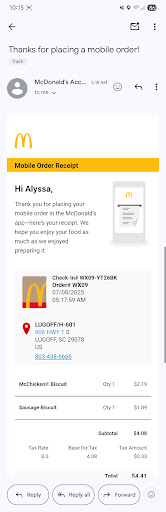 Also, previous visits to this location were subpar at best. Drive thru is usually very backed up, dine in is stuffed (typically with Dashers who are being straight up ignored), and curbside takes just as long as drive thru if not longer. My food wasnt really fresh almost every single visit, but I paid for it and I was hungry so it wasn't worth hassling anyone about. Lugoff McDonald's definitely needs some love and attention to streamline their workflow to keep as many people happy as possible and maximize profit. Overall, it is a McDonald's and is on brand for many other locations along the East Coast I've been to. (I had such an early start to my day and I really just wanted something quick and relatively cheap to eat. Nothing else in the area other than some gas stations were open, otherwise I would've...