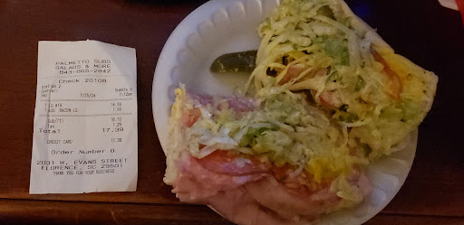 Read moreI wanna take a moment to really rate these guys into the way they should and beyond more..first off I'm not from here or even close to being from here I'm from Texas and my other half was suddenly taken out of my life and she's the only reason I was here because this is where her family is from this is where she was raised up so I know absolutely a hand ful of ppl and i barely kniw them just hi and bye but anyways .. im starvin at thus very moment at the house so i decide to take a afternoon stroll just to see whats going on and i pass this restraunt thissandwich shop and decided to smoke a cigarette in the back a coupleppl workers walk out and i jjst simoky ask en if they had any leftovers and she sed look walk thru tjat front door rt there and someone will be with u ..as it went iwalked in and a man asked me what wanted i told him whatever he preferred he made me the best sandwjch and they gave me a drink and ive never had such polite ppl in my lil 20 minute sandwich afternoon delight in my life.. thank u palmetto subs ..y'all rockk yall are most def my favorite place in Florence a keep up the good work .. this world needs make...