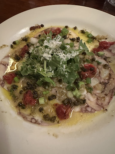 Letâs move on to the food. We came in for the octopus carpaccio. I love carpaccio, and I have had beef carpaccio and salmon carpaccio and a wide variety of other types, but the octopus was just a miss. It was too chewy. Maybe if it was really microplaned then it would have worked. I know octopus is chewy, but Iâve also had it prepared where it can be cut with a butter knife and melt in your mouthâŚ.this was not that dish. It was very chewy.