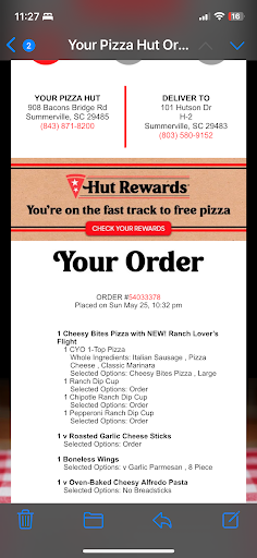 Read moreI ordered a pizza, two salads and chicken wings at 9:00pm. I received a text my order was out for delivery. Received another text saying my order was being sent via Doordash. The lady text I received stated my order had been modified or canceled and to contact the store for additional information regarding my order. Meanwhile, my debit card was pending $62.71 which included 18% tip. I called twice to speak with the manager. The call was automated and stated the store was closed. I called my bank to cancel the transaction. Because it was pending, I couldn’t. Today (3 days later) Pizza Hut on Bacons Bridge Road Summerville SC, collected the transaction from my account without me EVER getting my food order. I will NEVER order from them again. I had to order from Dominos and I don’t like their food. I love Pizza Hut. But, will NEVER order from them again. Thank you Pizza Hut on Bacons Ridge Road Summerville SC for the disappointing experience. If I was the GM or owned a Pizza Hut, my customers would ALWAYS be 100% satisfied. That store GM and manager needs to...