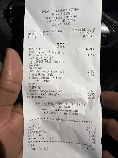 Ā Ā Ā Read moreAfter working an incredibly long shift, I decided not to cook and buy my family a good meal. My first mistake was stopping at Garner's Ferry Popeye's. I waited in the drive thru line for about 15 minutes before placing my order. It was after work and they were busy so I was OK with that. I placed my order and pulled up to the window 10 minutes later. The cashier attempted to confirm my order and collect payment. The order was wrong even though it was confirmed at the speaker before telling me my total (STRIKE 1). I ordered lemonade and diet coke with my order. When I got home, I discovered the lemonade was actually water. (STRIKE 2). The rest of the food was a huge JOKE. The tenders were dried out, left over food I'm hoping was from lunch but who knows (STRIKE 3). The biscuits were white which indicated to me they were not done (STRIKE 4). I ordered their chicken sandwich on this trip too. This was my first time ordering this sandwich. I've heard good things about the sandwich so I was really happy that they were not sold out. When I opened my sandwich, I discovered that they had give me 2 bottoms of the bun. I don't eat the ends on a regular loaf of bread so I was ticked (STRIKE 5). In great haste, I rushed to complete the survey on the receipt. I was not after the promise of some free chicken, I wanted to slam them as hard as I could. I will NEVER eat at this location again. If they are the last restaurant open and I'm about to fall over from hunger, I will starve before I step foot into this...