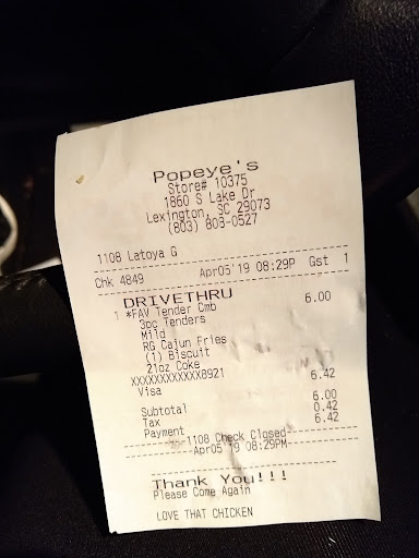 Read morePer the receipt I came here on a Friday evening. This location doesn't close till 11. I placed my order and was constantly interrupted and told to hold. When I did get around to placing my order the employee kept repeating it back to me incorrectly too. She was very distracted which made the ordering process annoying for me. I wanted cajun rice as my side item with my 3 piece tender meal and she initially told me okay but then got back on the speaker and told me that they were "all out of cajun rice for the night." This is truly more annoying to me than McDonald's ice cream machines always being down. I was not told they were out of stock. I was told for the night. This implies that they had the ability to make more rice but were choosing not to despite not closing for almost 3 more hours. This is horrible customer service in my opinion and missed money and morale for the store. I was given more tenders than I ordered which was a nice gesture but I'd have preferred my order with the normal amount and the side item I'd wanted. I personally don't mind waiting a little bit if an item I want needs to be prepared fresh but I wasn't given that option. I also posted a photo of the food and receipt to show that neither match up. I got what I ordered all in all but had there been any other issues the order being printed wrong could have caused more stress. The only thing that salvaged this experience is that the food was very good. I'm a big fan of Popeyes but not happy with the service period. If not for good taste this would have been a two...