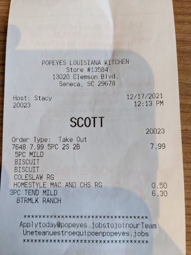 Read moreI have been through this particular Popeyes three times now. My first experience was great, no complaints. However, the second time I visited this restaurant, I went through the drive-thru and ordered a six mild tender combo. After driving home and checking my order, I saw that I was handed three in-bone pieces of chicken, and two of the smallest tenders I have ever seen. The food had obviously been sitting in the bottom of its bin for a while.