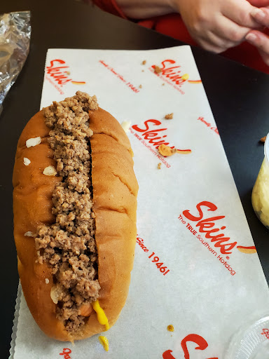 Hotdog stands, as they were once known, have been a highlight of local fast food dining for about 75 years (more?). Skin's is the best and most successful chain in upstate SC. All locally owned— still no franchisees — meaning better quality control and a more consistent experience from one location to another. Other than being among the last and best hotdog stands, what makes Skin's special is their unique hot dogs. Their frankfurters are high quality and less salty or spicy than some. Their chilli is especially unique. It stands in harmony with the flavour of the wiener itself, not overwhelming it. Many hotdog chillis are of poor quality beef, not minced finely enough or overwhelmingly spicy, sweet or both. Skin's? Quality, finely minced, not bland but not overwhelming flavoured. (I suspect some other places use intense chilli flavour to mask the lesser quality of other ingredients.) The buns seem to be steamed, but never soggy. These are hotdogs prepared the Carolina way. If you're looking for consistent quality go to Skin's, if you are looking to indulge your nostalgia for New York, Philadelphia or Chicago, go elsewhere; but be warned, by doing so, you may find different but you won't find better. Unlike any other fast food restaurants Skin's offers table service. And it's fast...