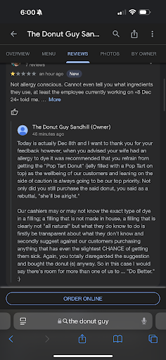 I personally wasn’t going to leave a review, but as a business you should be able to identify allergens. And you shouldn’t lie, my husband never said “she’ll be alright” he bought the pop tart donut because I said it’ll be okay you can take it to work.