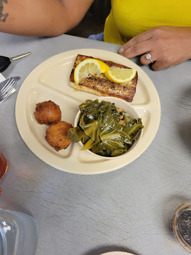 Plate 1- Fried shrimp, smashed potatoes (red potatoes with skin on but little flavor or seasoning), collards, 2 hush puppies and water