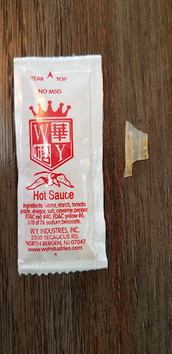 Read moreI usually don't post about bad food experiences but this one almost hurt my 2 year old son, so I'll show no remorse. This piece of hard plastic was found in either the house special fried rice, shrimp with garlic sauce, or kung pao chicken. I drove back and gave them the piece of plastic in a napkin and explained that this almost harmed my child and they need to be careful. The only response was that "I'm sorry" - I only ask for them to please be more careful in the future when serving food to people, small mistakes like this can cause serious harm that could be fatal to a child. Added a pack of hot sauce in the pic to reference the size...