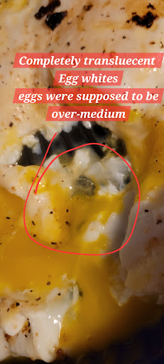 I asked for 3 eggs and over medium.When I cut into the eggs they were literally raw. Completely translucent whites with a very thin cooked film over the top, somehow the bacon was burned and inedible, and the potatoes in my son's hashbrown were so undercooked that they were actually crunchy.