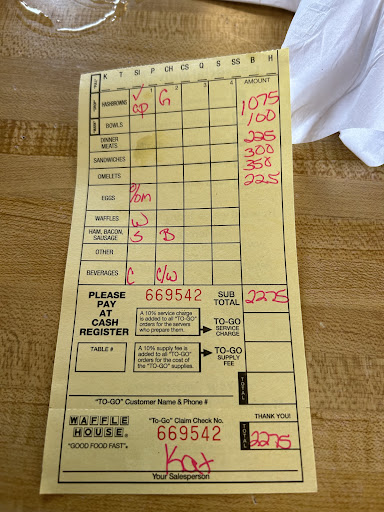 Usually, we don't have an issue with this particular Waffle House. At least now we know if we see two certain white women, we need to get back in the car. Waitress seemed so bothered that they had customers (when you're relying on tips, you're supposed to change your attitude). How dare we bother her while she tried to eat her one free meal? Cook was rude. Placed a to-go order. Waitress misheard us while we ordered and called out the wrong thing (I knew because I was a waitress at WH years ago). We corrected her. The cook sided with the waitress, claiming she "heard us order it that way." We were stunned by how she spoke so rudely. It was honestly almost laughable. Again, we corrected how we wanted the hashbrowns. Well, low & behold... once we arrived home, the burgers were undercooked, hashbrowns were definitely not the normal portion, and the food was practically inedible. The moral of the story, if they're rude and they're cooking your food, leave. Immediately. Request a refund. Do what you have to.