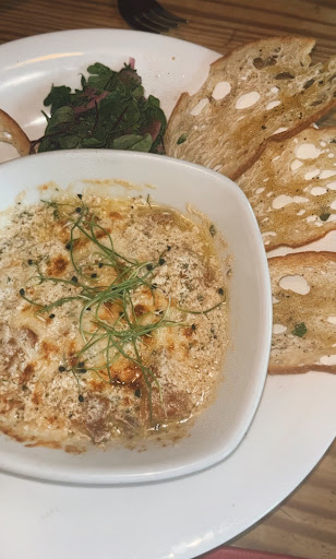 Iāve never had a peach pie before but this was to die for. The crust had some kind of nut mixed in Iām assuming walnut. All deserted are made from scratch in house and you can tell. This was genuinely the best dessert Iāve ever had. My husband had the death by chocolate cake which wasnāt what I expected when you hear the description you expect a tall traditional cake. This looked more like a pie. But it was the perfect size because itās so rich but in a perfect way. The mousse balances it out and the little crispy things on the top were my favorite. We also had the biscoff blueberry cheesecake to me it was just okay in comparison to the peach pie which is surprising to me because Iām obsessed with biscoff. For entrees we had the braised bison brisket and the chicken parm. Get it. Get both my husband preferred the chicken parm and heās generally a red meat guy but the chicken was amazing something about it just stood out on its own without any sauce or anything itās perfectly cooked and had amazing flavor. The pasta was also not what I was expecting itās a different style noodle but wow. And it was tossed in Alfredo sauce then plated on marinara and topped with the chicken. Usually Iām a pictures person and thatās the one thing I didnāt do but it was perfectly plated and could absolutely be split between two people. The braised bison brisket with Parmesan polenta, braising sign, gremolata. I had no clue what half the words were but it tasted amazing. The polenta was similar to a cheesy fluffy grit in my opinion. Iāve never ordered an entree and not wanted to add something weather it be salt pepper anything. But this was a first. We had the crispy calamari which wasnāt very good but after the entrees I gaurantee anything you have will be amazing. Next time we will be trying the charred octopus because that looked amazing and so did the warm bread.