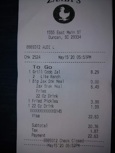 Read moreGot Zaxby’s tonight from this location. Ordered a wimpy boneless wings meal and a wimpy boneless wings and things meal. Asked for a zestible dip, was charged for a zestible dip, but instead received a sauce cup filled with nuclear sauce. Now who orders wimpy wings and wants nuclear sauce on the side? Better yet, how do you mistake zestible dip for nuclear sauce? This isn’t the first time this location has botched something up on our order. Did I mention that they were about to give us 2 boneless wings meals instead of the wings and things? Those extra things are important, especially when you pay for it. We also didn’t get any plastic ware with the 2 meals. If you enjoy not getting what you pay for then this is the place for you. If you want good chicken with good service and your order correctly prepared, go to Chick-fil-A. For some reason they’re the only fast food restaurant that seems to get your order correct 99%...