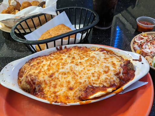 Food: 3 stars: Ordered the vegetarian stromboli, the sauce although strong with garlic, had no other taste to. Then the dough was bland and slightly overcooked -1. My wife ordered a tossed salad that had a mushy tomato in it, shredded lettuce and a few onion slices -1. The mozzarella sticks were good and the kids spaghetti was good for a kid because of the flat sauce.