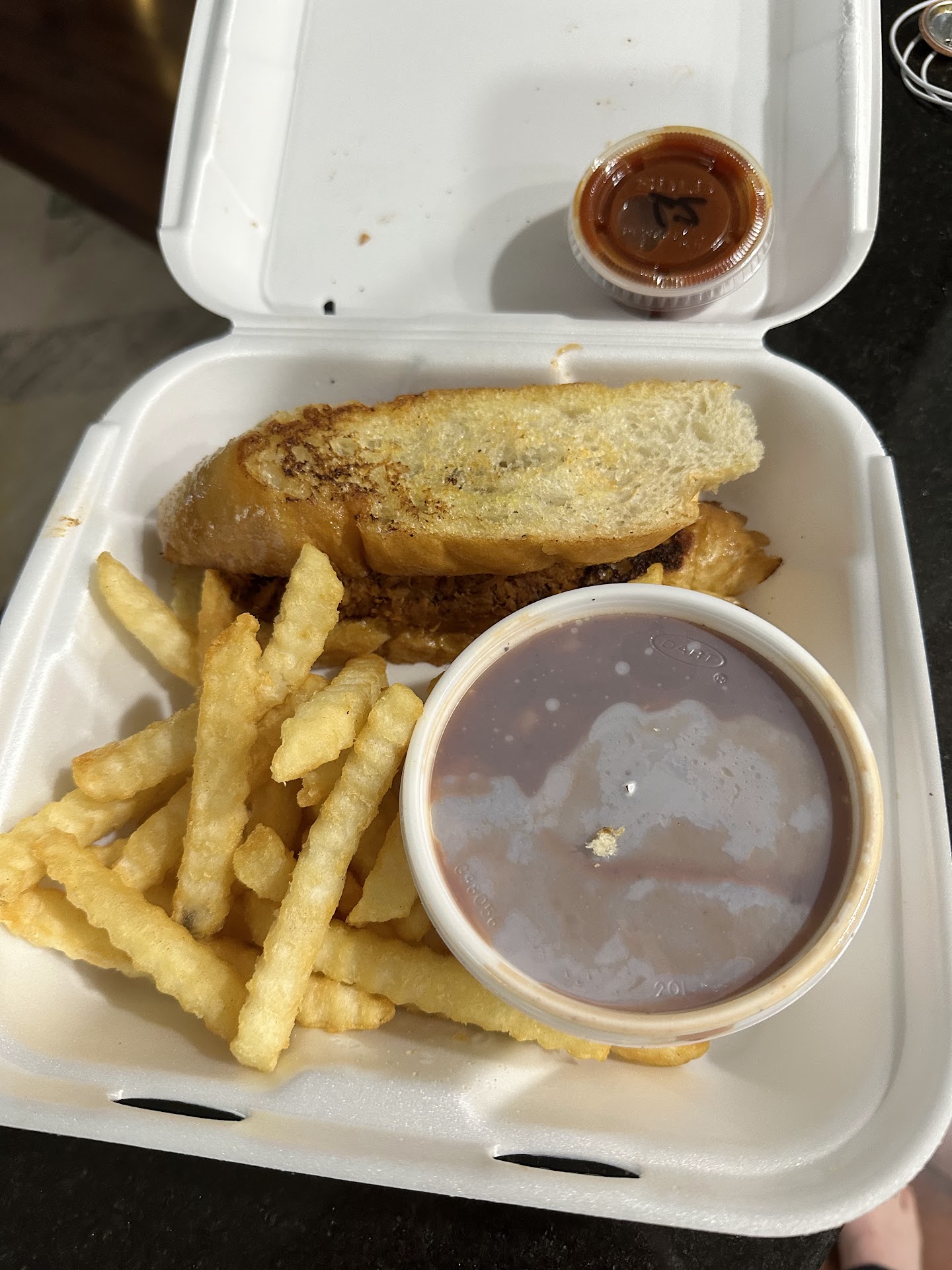 I had the sliced pork with garlic bread, onion rings and cole slaw. The pork was moist, almost too moist actually. No flavor at all. I too tried the sauces, very disappointing as I mentioned thin and low flavor. The garlic bread was so tough you had to pull on it hard with your teeth for a piece to break off. I think they forgot the garlic. The onion rings, which they had told me were made by them, tasted like uncooked dough yet crispy. Weird