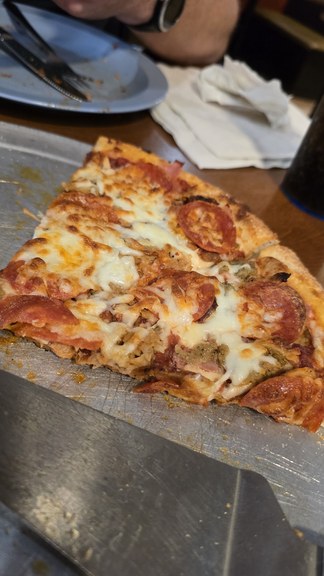 We came in and i felt tense INSTANTLY when our waitress cane over to “greet” us (which she didnt, all we got was a “how many” and she looked miserable) right away i was thinking GREAT🙄) we got seated at a booth which was sitting under an air vent (that wasnt a big deal but what was..) the vent was dripping water onto the table. We somehow got switched servers (thank goodness cause ours as stated earlier looked miserable and i couldnt stand it) asked to be moved to the table next to us which we did. Anywho. Our server wasnt bad in-fact she had a better attitude (still wasnt 100% not Miserable and didnt smile, but her tone of Voice was better). We got our food which was as i said delicious! Couldn’t have asked for a better pizza really. So got our bill, paid and i gave our waitress the book thing in hand with our bill (i pay cash alot when out of state). Omg our waitress SMILED and here is why!