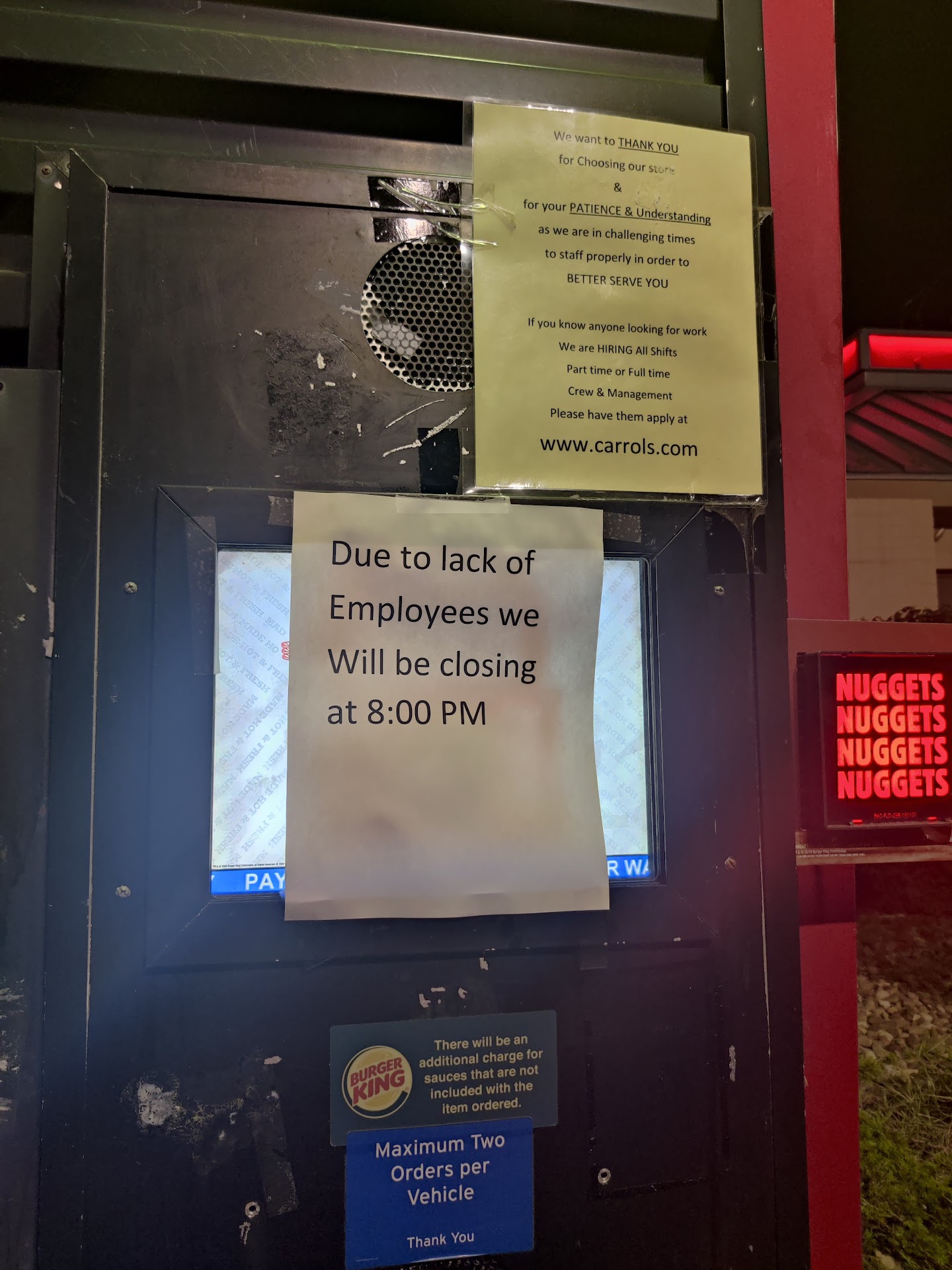 I waited in the drive-thru line for more than twenty minutes, because my mom wanted a Whopper, and she hasn't been feeling well, so I had to get her that Whopper. So, I waited in line, saw two employees come out with signs to tape on the drive-thru speaker, and when I finally got to the speaker after almost a half hour in line, it says that their broiler is broken, so they're only selling fried foods.