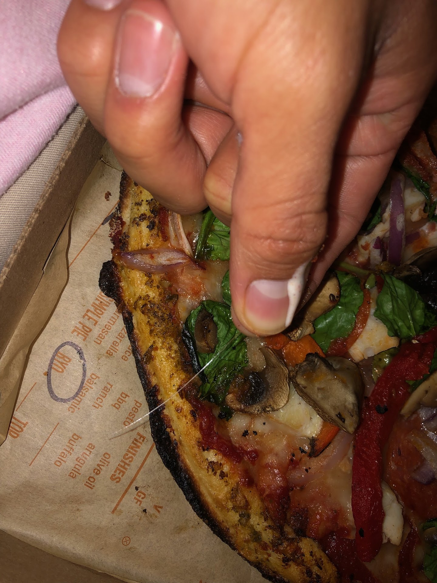 My order included two build-your-own pizzas, a side salad, and pesto garlic bread. I also requested utensils, napkins, chili flakes, and parmesan packets. When I arrived, I couldn’t simply grab my pizzas and breadsticks from the counter because my side salad was still behind the register. While waiting for the staff member to retrieve it, I noticed he already seemed irritated—despite us not even having spoken yet.