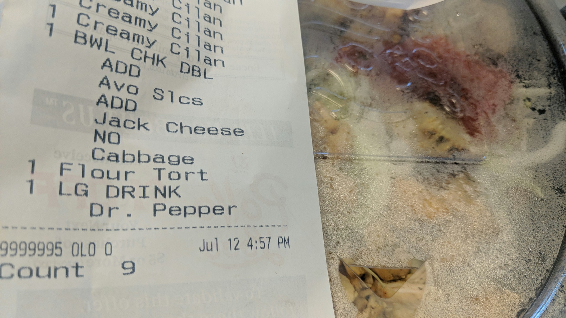 July 9th 2021, I ordered a Tostada salad and double chicken bowl with extra avocado and cheese and extra creamy cilantro dressing. No cabbage, Order perfectly made.